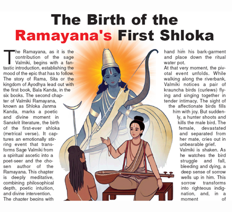 event that transforms Sage Valmiki from a spiritual ascetic into a poet-seer and the chosen author of the Ramayana. This chapter is deeply meditative, combining philosophical depth, poetic intuition, and divine intervention. The chapter